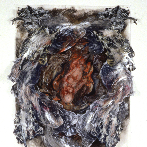 The artwork is by JUNKO CHODOS, a collage of computer prints and acrylic on industrial mylar, 8 feet high and 3.5 wide. It is the first work in her "Esoteric Buddhism" Series, completed in 2001, and it is titled "Birth." The other works are titled "Ecstasy" and "Death" - and perhaps that sums up a human life!